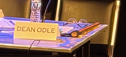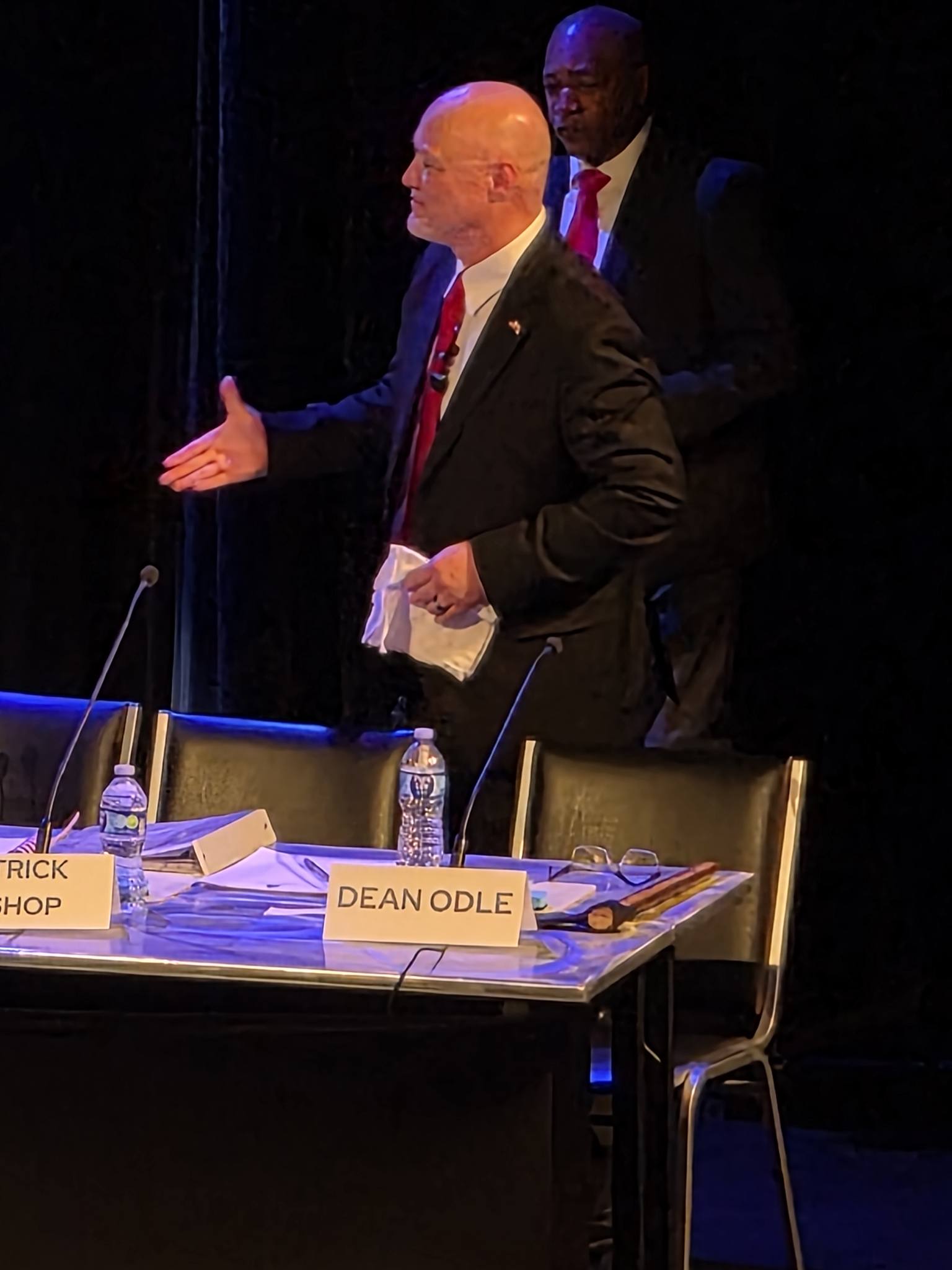 I sat toward the back as the room was already filling. At one point, I considered bringing a mug with a CIA logo and sitting in the front row near Odle—glad I didn’t, since he had a weapon on stage. I alerted someone to it, and shortly after, the debate moderator had Odle remove the weapon, which was handed to his family (as if that made it any safer).