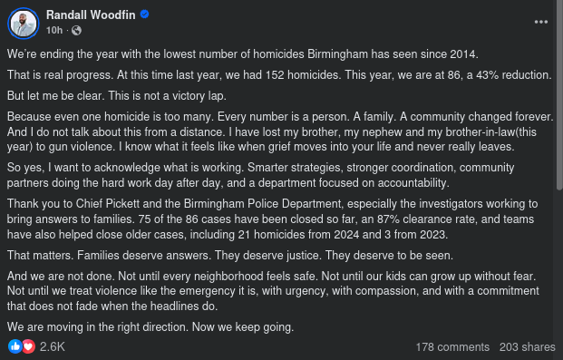 Mr. Woodfin's post in a nutshell, is that Birmingham's murder rate is lowest since 2014. In a vacuum, this would be cause to celebrate. However, that isn't the whole story.