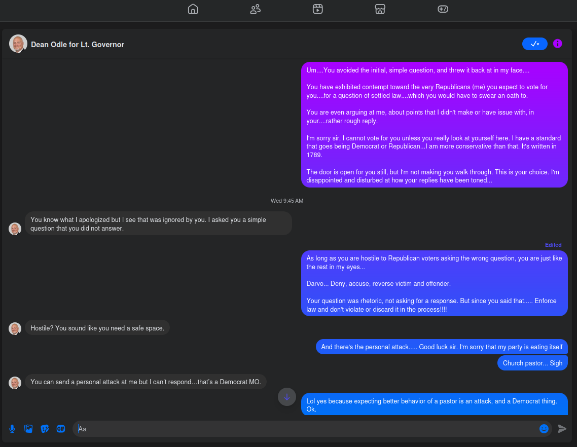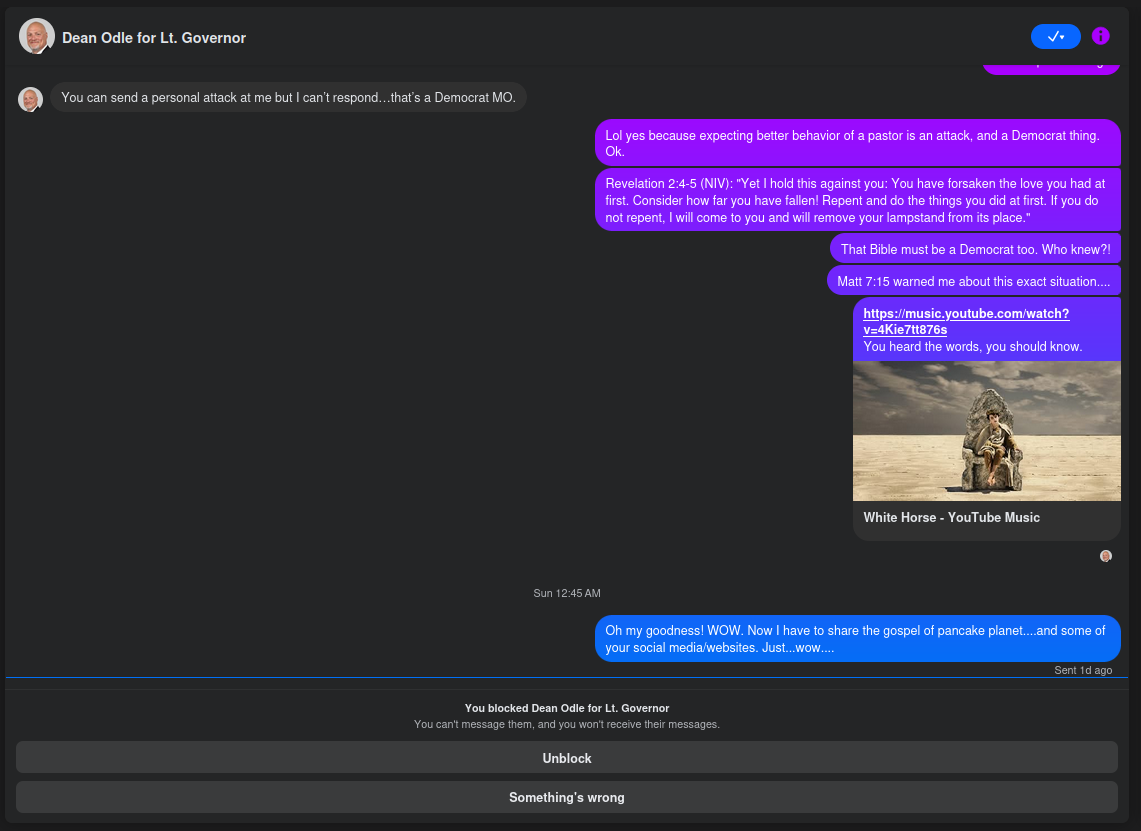 It does check out with what other s have mentioned. His church had a rather scathing Google Review from a while back, and an anti-Dean Odle Facebook out there. - IMPORTANT POINT: He claims that he wrote back to me, but he couldn't have. He was blocked before that, because I was honestly done - and I knew he would double-down.